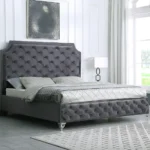 Bed with Gray Plane Velvet Fabric Cushion with Tufted Work.